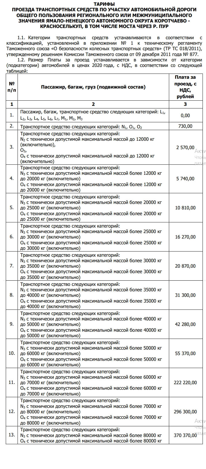 Для начала посмотрим на тарифы Пуровского моста и понтонно-мостовой переправы.